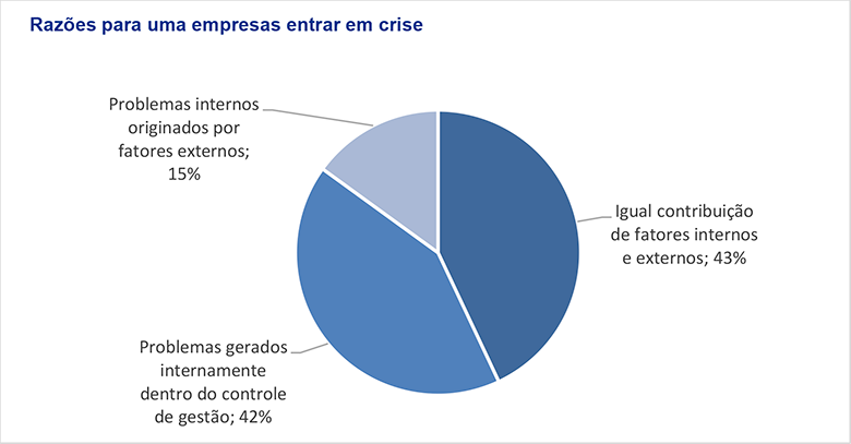Ainda, de acordo com a pesquisa promovida pela KPMG, 43% dos pesquisados acreditam que as principais causas para um negócio entrar em crise é uma igual contibuição de fatores internos e externos. Enquanto que outros 42% acreditam que a crise é causada por problemas gerados dentro do controle dos executivos. Apenas 15% acreditam que a crise está relacionada a problemas internos originados por fatores externos e, ninguém, aponta que os problemas de uma empresa são causados, exclusivamente, por fatores externos e fora do controle de gestão.