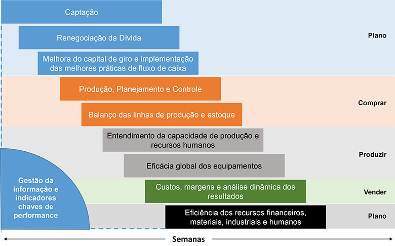 Ações foram tomadas visando o controle imediato de saída de recursos da empresa, a renegociação da dívida existente e a captação de novos recursos. O foco dos trabalhos foi dedicado à compreensão dos requisitos gerais de capital de giro da empresa (contas a pagar, contas a receber, estoque, etc.) com foco na identificação e melhora da eficiência do cliclo produtivo.