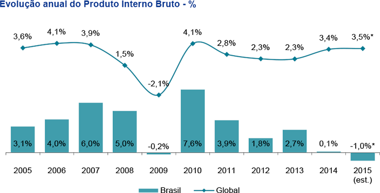 Contudo, diferentemente do cenário positivo até meados de 2013, o atual panorama político e econômico brasileiro provoca apreensão em investidores e desafia a continuidade das atividades de empresas atuantes em diferentes setores da economia. A diminuição da atratividade para investimentos no País é influenciada por fatores como o péssimo desempenho industrial, medidas fiscais heterodoxas adotadas pelo governo, inflação acima da meta, corrupção, baixo crescimento em 2014, riscos como o racionamento de água e energia e, ainda, uma elevação do custo de insumos básico. O Fundo Monetário Internacional, por meio do estudo World Economic Outlook (WEO) divulgado em abril deste ano, aponta retração de 1% para a economia brasileira em 2015. Concomitantemente, a demanda interna tem sofrido impacto direto da expectativa na redução da expansão do estoque de crédito e no aumento do endividamento das famílias brasileiras. A possibilidade de queda na demanda impulsiona a necessidade de adaptação das empresas perante as mudanças no atual contexto econômico.