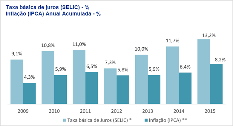 ** A inflação (IPCA) corresponde aos percentuais do ano acumulados até dezembro, exceto para 2015 em que a taxa é acumulada até abril.
