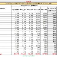 A maior empresa de energia elétrica do Brasil também figura entre as sete maiores desvalorizações na bolsa de valores de São Paulo (B3) durante mês de março, segundo levantamento realizado pela Economatica. Em apenas 20 dias (1/3 a 20/3), a Eletrobras perdeu R$ 27,5 bilhões em valor de mercado.
